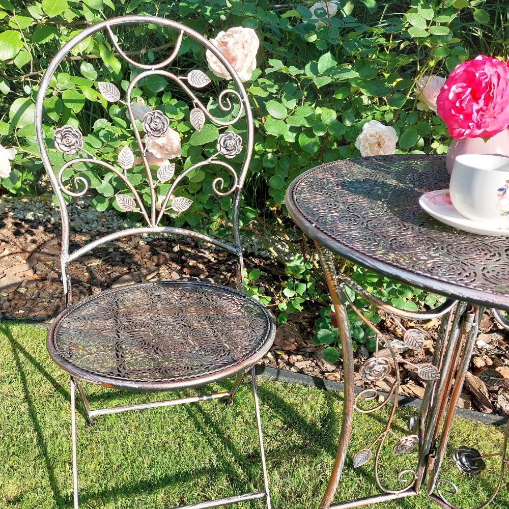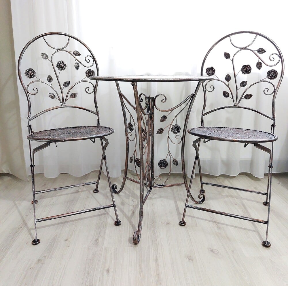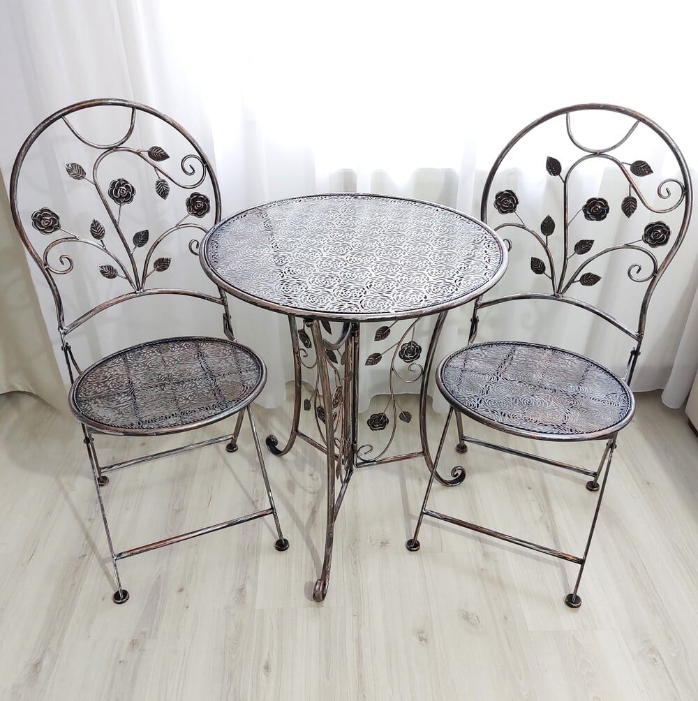Záhradný kovový set v provensálskom štýle je ideálne riešenie príjemného posedenia na záhrade, terase, balkóne alebo zimnej záhrade. Stôl a dve stoličky sú pevné, stabilné a vzdušné. Konštrukcia je zdobená ornamentami, antická hnedá farba dodáva nábytku výnimočný vzhľad.